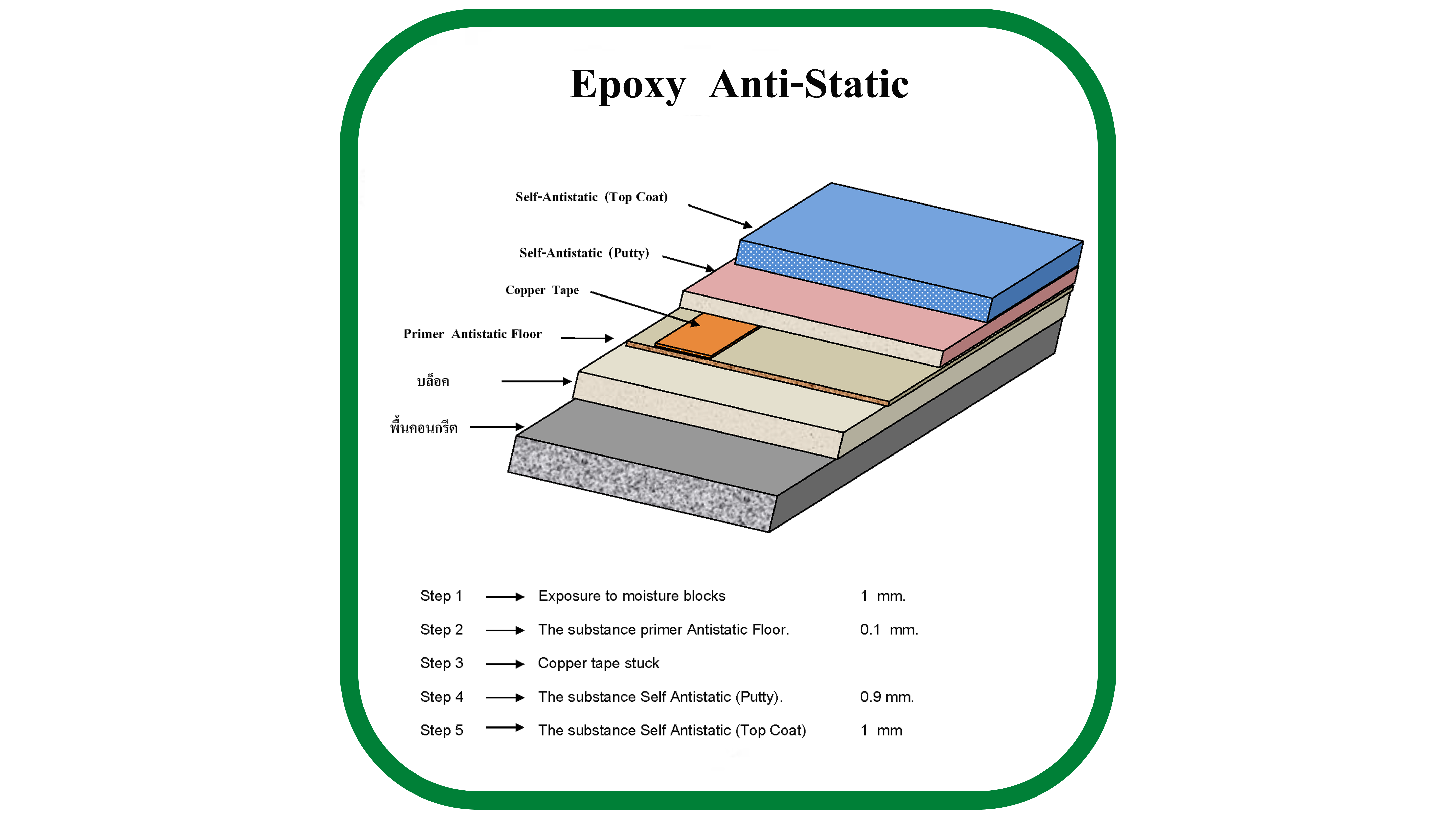 เป็นระบบพื้นอีพ๊อกซี่ชนิดป้องกันไฟฟ้าสถิตย์ ที่เกิดจากการสัมผัสและเสียดสีทางกล ซึ่งพื้นอีพ๊อกซี่ชนิดนี้จะถ่ายเทประจุไฟฟ้าสถิตย์ที่อยู่กับพื้นผิวลงสู่พื้นดิน เพื่อไม่ให้เกิดความเสียหายกับวัสดุหรือชิ้นงานอันเกิดจากไฟฟ้าลัดวงจร เหมาะกับพื้นโรงงานอุตสาหกรรมอิเล็กทรอนิกส์ ชิ้นส่วนคอมพิวเตอร์ ที่ไม่ต้องการให้เกิดความเสียหายกับชิ้นงาน
